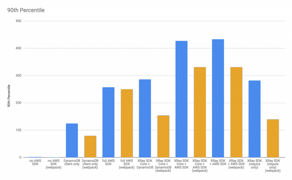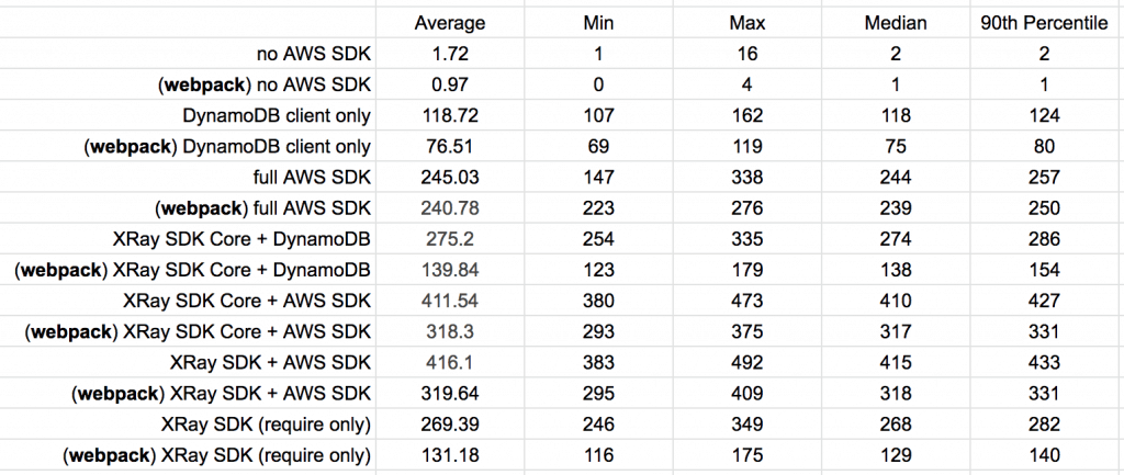 time averages only 1.72ms without WebPack and 0.97ms with WebPack. - Adding AWS SDK as the only dependency adds an average of 245ms without WebPack. This is fairly significant. Adding WebPack doesn’t improve things significantly either.