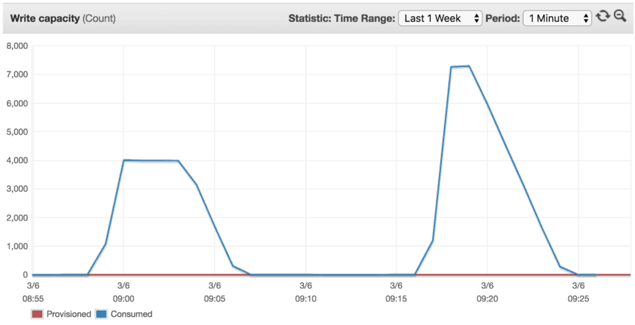 While that is the case, my experience with DynamoDB is that most tables are poorly utilized. A quick look at our DynamoDB tables in production paints a familiar picture. Despite the occasional spikes, tables are using less than 10% of the provisioned throughput on average.