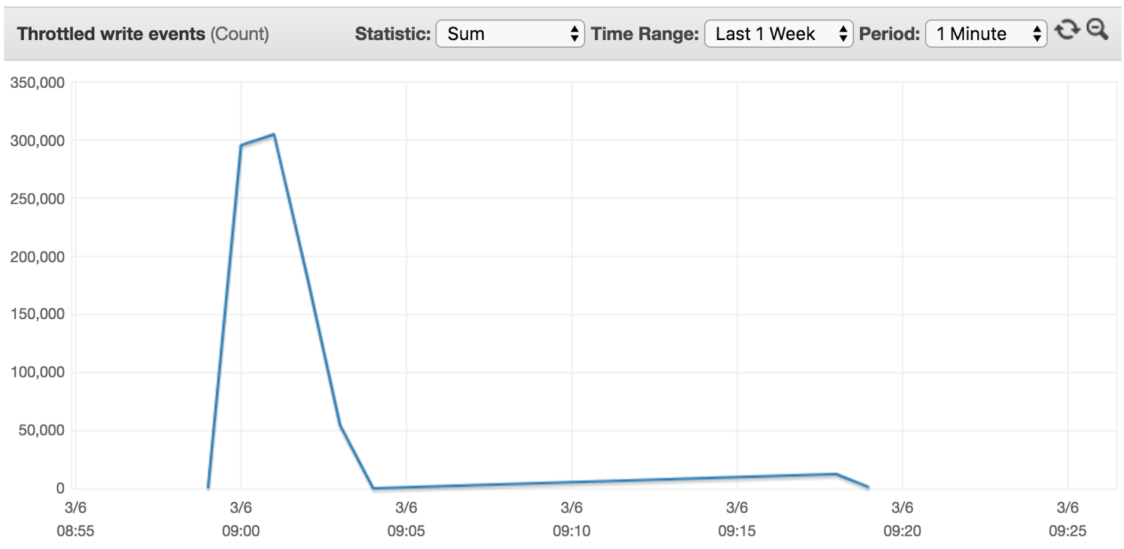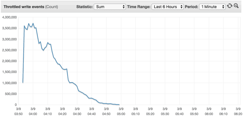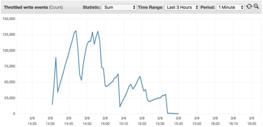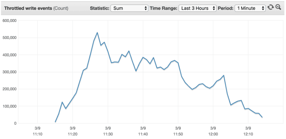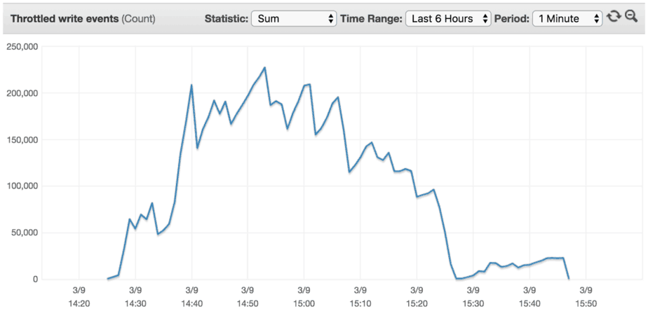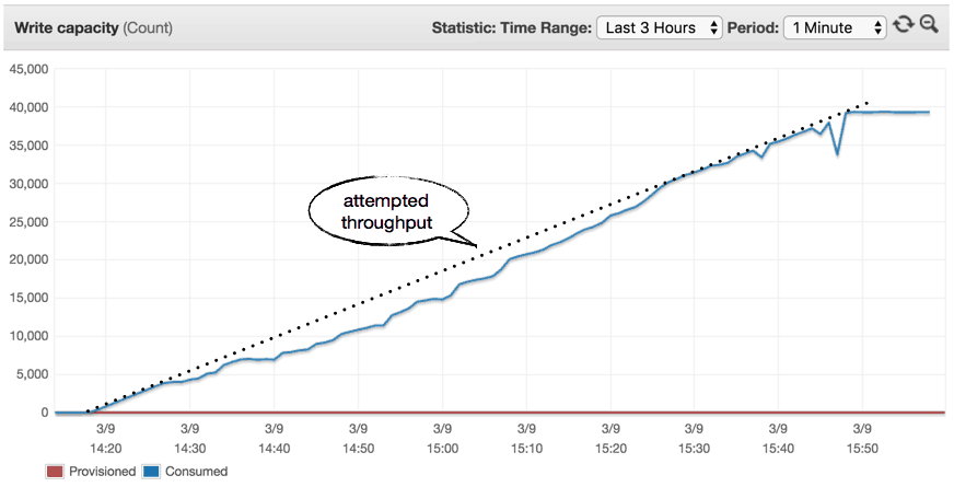 In this case, the traffic increases steady over the course of an hour until it reached 40,000 writes/s. As you can see from the results below, the rate of progression is too fast for the OnDemand table to adapt to on the fly. As a result we incurred a lot of throttled write events along the way.