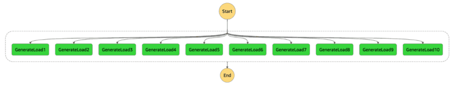 For this experiment, I had to use a different Step Functions state machine. Using DynamoDB BatchWrites, I was able to achieve around 10,000 writes/s from a 1GB Lambda function. So to generate 40,000 writes/s I needed to run multiple instance of this function in parallel.