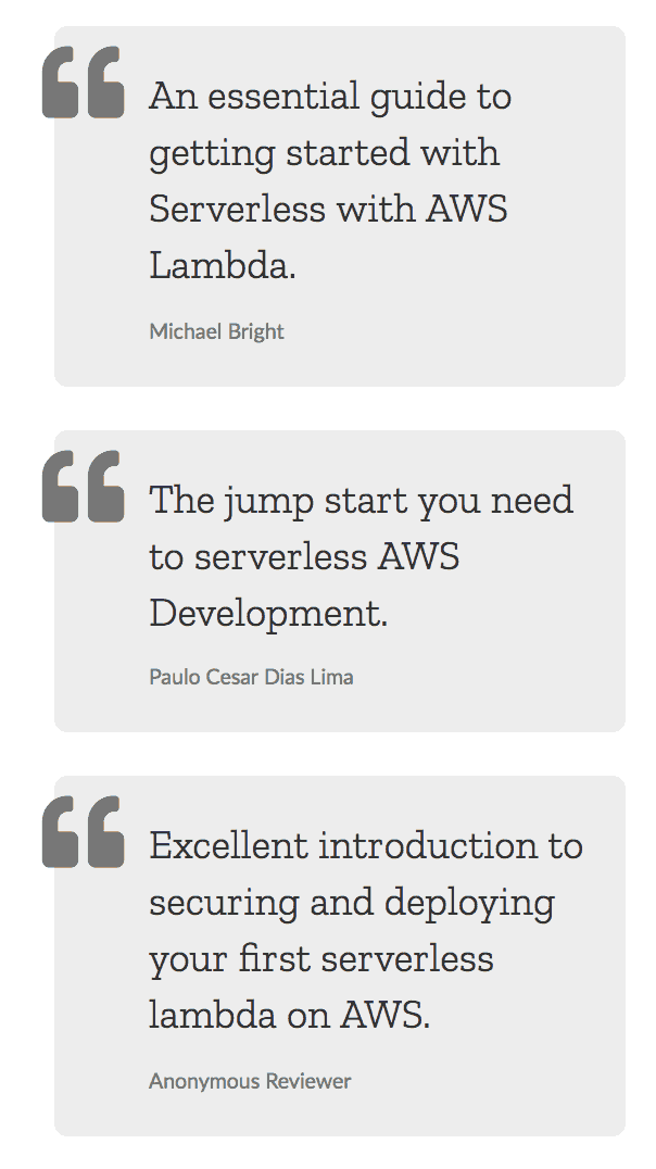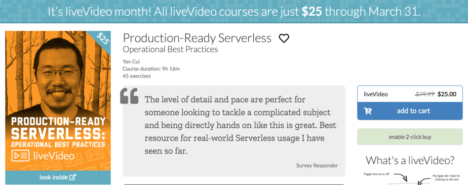 It’s been a long time coming, my Manning video course Production-Ready Serverless is officially completed! All postscripts and other course materials have been added to the course. Manning is also running a special promotion for March so that ALL video courses are $25 each, what better time to learn about serverless? ;-)