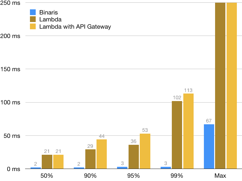 In Binaris we deeply believe in the power of serverless and the power of functions. We envision a future where applications are built entirely out of serverless functions. To enable this, we started out by focusing on invocation latency. We built a cloud serverless platform that fires up functions in single-digit milliseconds. Binaris is almost 40x faster than AWS Lambda (and similar serverless platforms) at the 99th percentile, and also faster than most self-managed container or instance based services: