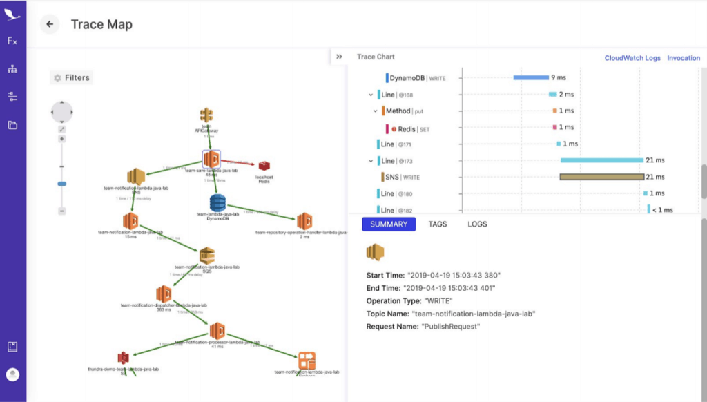 Serverless architectures are usually implemented on event-driven distributed functions. Monitoring such applications can be a daunting task with the old school methods. Thundra helps companies and developers effectively monitor and troubleshoot their serverless architectures with zero overhead. To unlock Thundra, all you need to do is adding the AWS Lambda Layer to your functions. Thundra’s full tracing capability combines distributed and local tracing enabling developers both to track the messages exchanged in serverless transactions and to trace the values of local variables inside the functions. Thundra names this capability as “visibility from the bird’s eye view to the tiniest detail”. This flexible tracing reduces the troubleshooting of serverless application by nearly 90%.