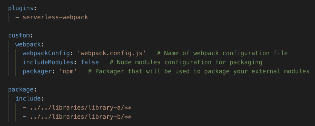 - Use webpack to resolve and bundle them into the deployment package. If you use the Serverless framework, then check out the serverless-webpack plugin. For example: