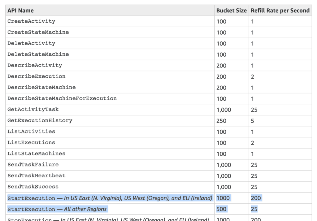 This workaround also alleviates the scaling limit on starting too many tasks in a burst. Instead of starting a Step Functions execution right away, we would write items to DynamoDB (with TTL) instead.