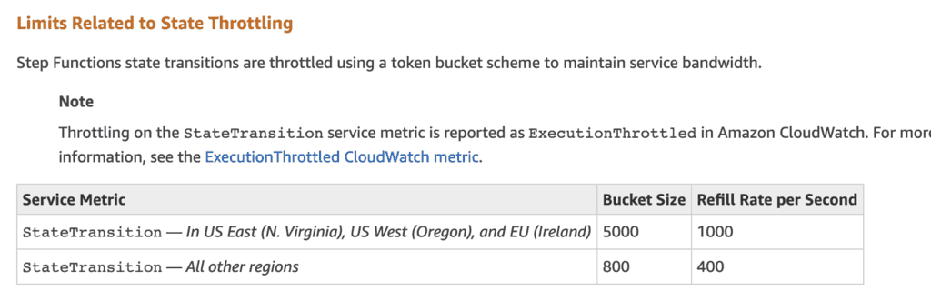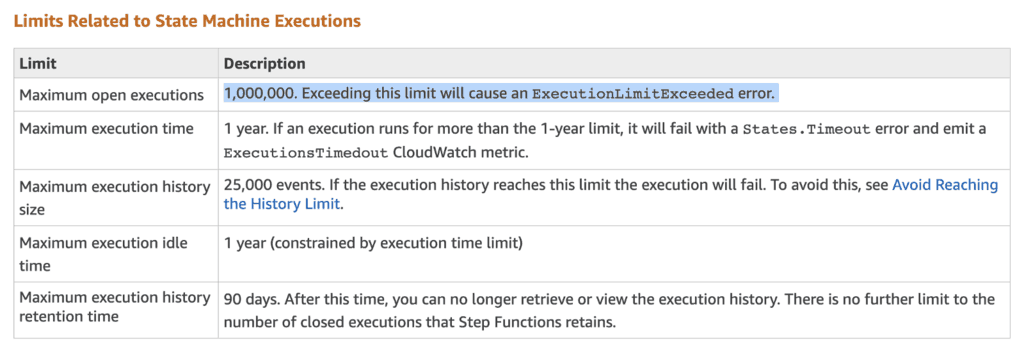 Step Functions also has a hard limit of 1,000,000 open executions – that is, executions that have started but not yet finished. This will be the maximum number of open tasks we can schedule with Step Functions.