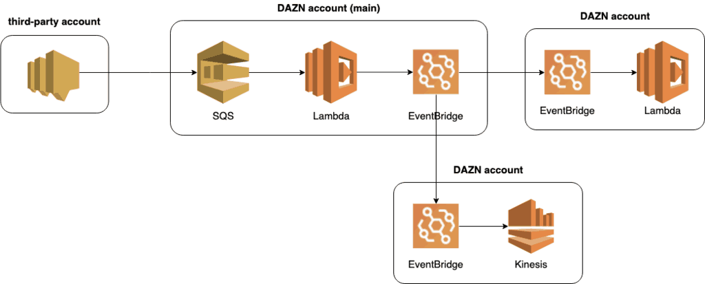 Switching to EventBridge would be another option. SNS supports few targets for cross-account delivery – HTTP, SQS or Lambda. EventBridge can deliver to far more targets, including Kinesis streams, ECS tasks, Step Functions and more. However, this requires significant changes from the third-party. Or it involves creating a DAZN-side sink in the main account and then use EventBridge to fan out to other accounts (see below).
