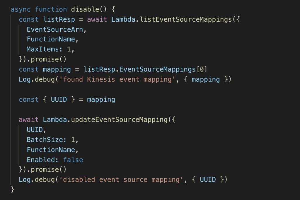 After that, you should see the logs to indicate the function is attempting to disable its Kinesis event source mapping.