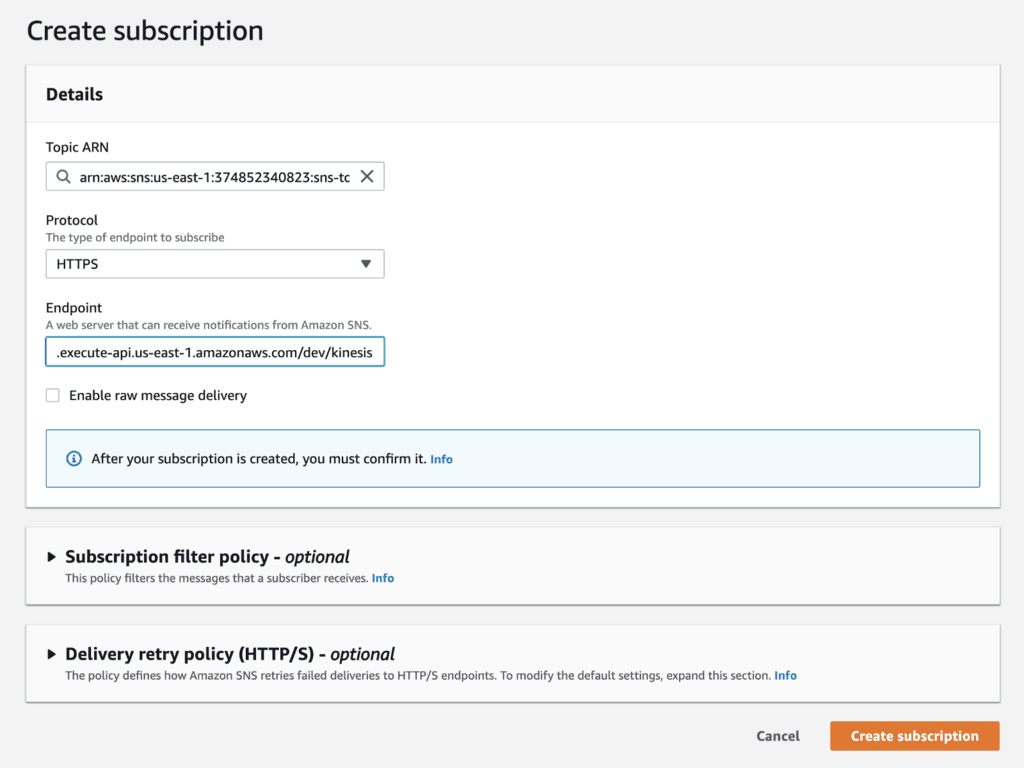 Once the project is deployed, go to the SNS topic. Create a new subscription against the /kinesis
