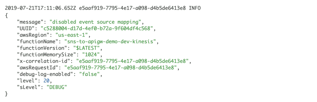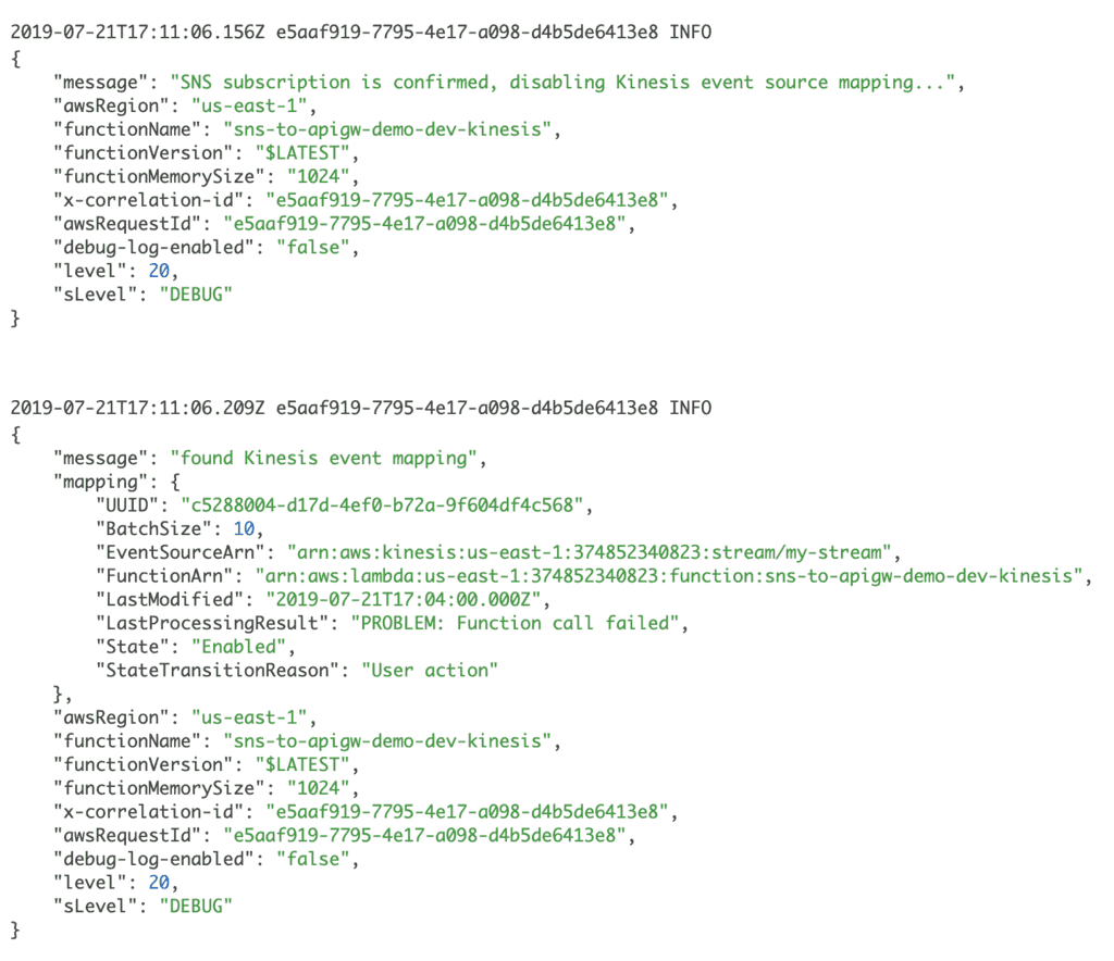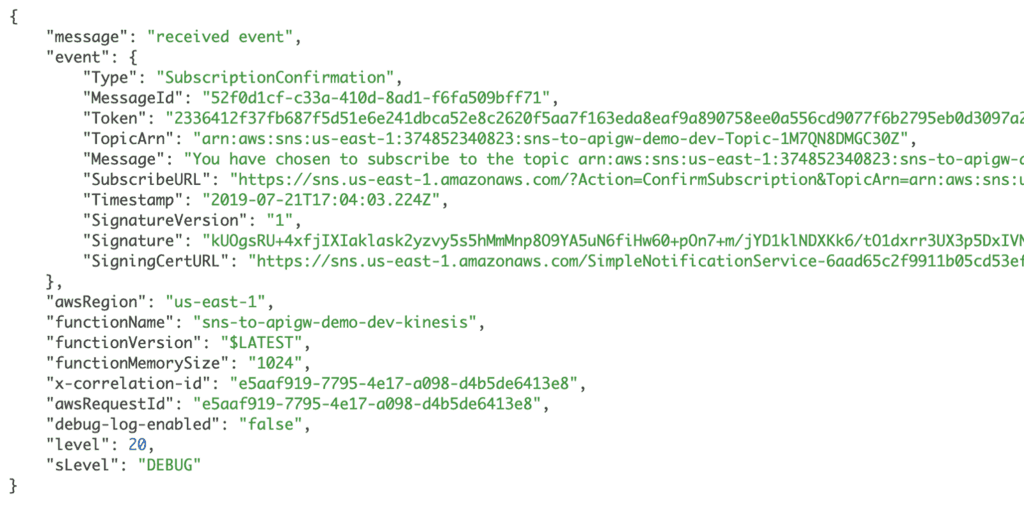 In the Kinesis function’s logs, you should see a SubscriptionConfirmation