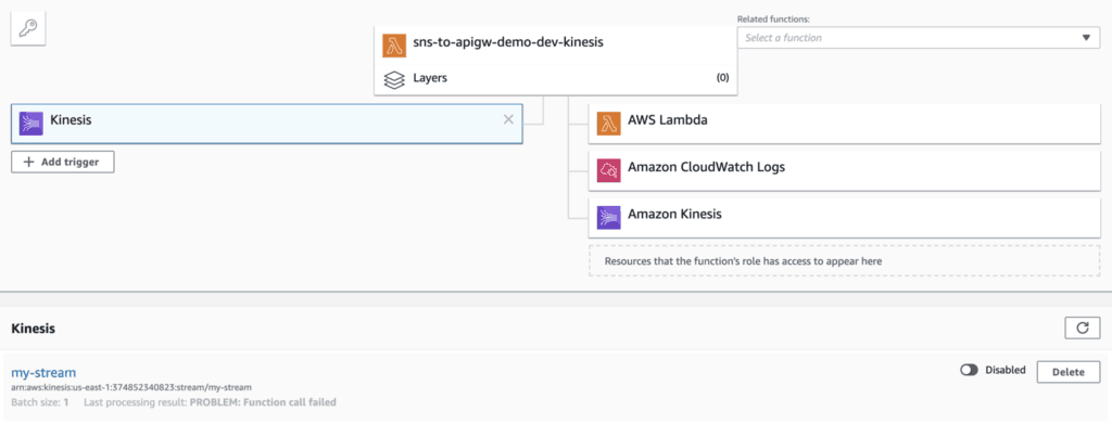 Now go to the Lambda console, and find the Kinesis function. Click on the Kinesis event source, and you should see its status changed to Disabled