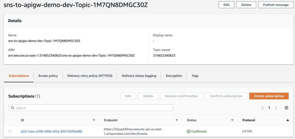 Meanwhile, if you go back to the SNS topic then you should see the subscription has been confirmed. If you publish a message to the topic then the message would be recorded in the stream but would not invoke the Kinesis function.