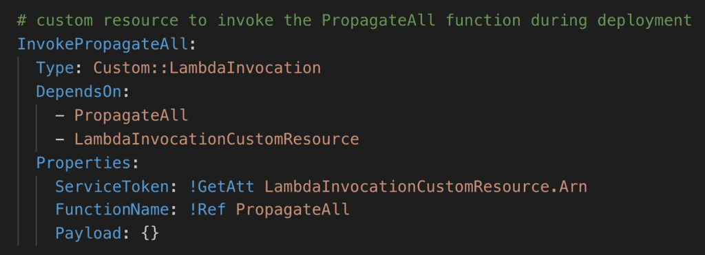 Turns out, I was wrong. You can include the custom resource Lambda function in the same CloudFormation stack that uses it. In hindsight, I was overthinking things – in essence, all we are doing is referencing a Lambda function by ARN. You’ll see what this means later.