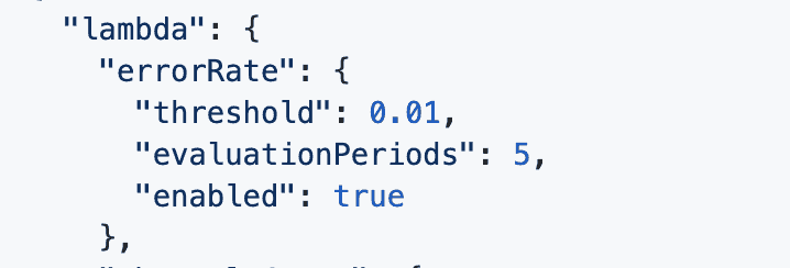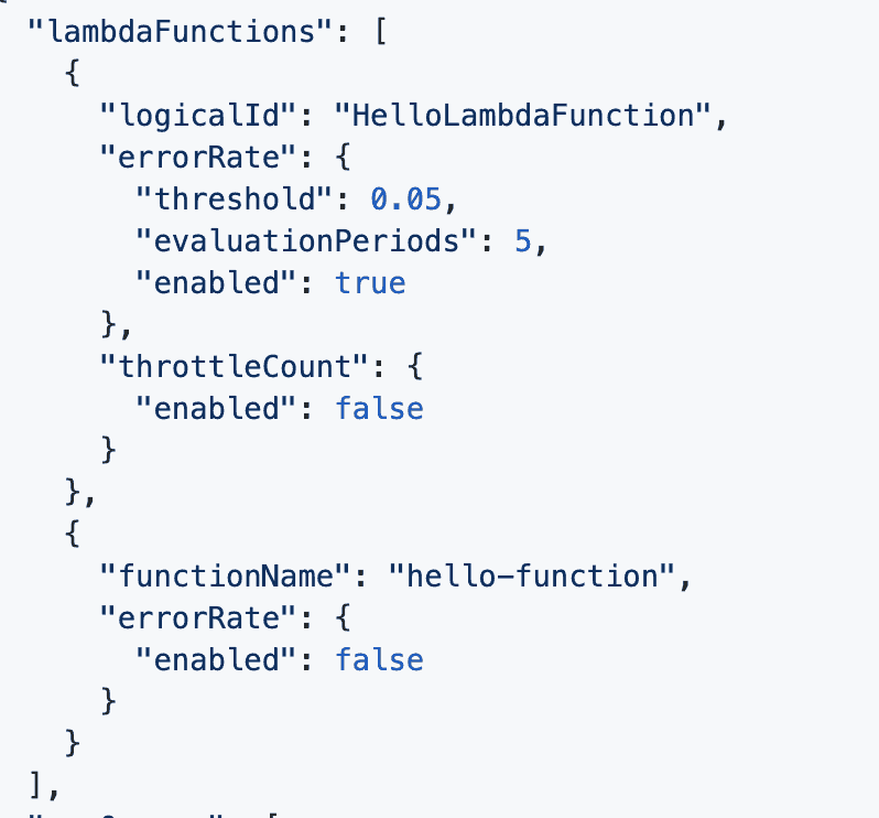 For a particular CloudFormation stack, you can also override this default configuration for particular functions. For example, you may choose to disable certain alarms or to use a different threshold.