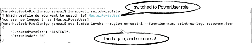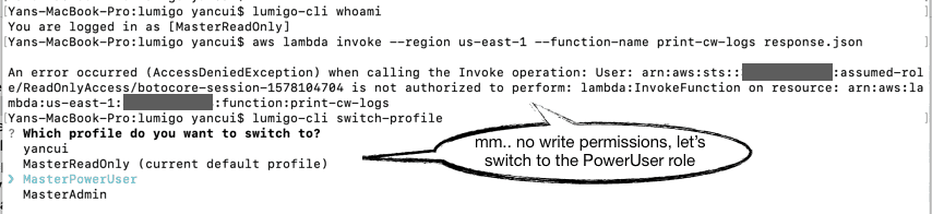 On the other hand, for ANYONE who’s using AWS and find it a pain to switch between named profiles, I also updated the whoami and switch-profile commands to support assumed roles (normally configured in your .aws/config).