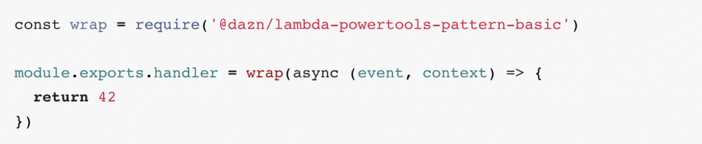 Amongst other things, this wrapper applies the correlation IDs middleware which automatically extracts correlation IDs from the invocation event and stores them. Whenever you use the dazn-lambda-powertools-logger, the captured correlation IDs would be automatically added to the JSON log message. This way, you don’t need to manually extract correlation IDs from invocation events and always remember to include them in your log messages. Just use our packages and correlation IDs would flow through your functions automatically!