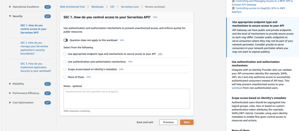 And today, Amazon has added the Serverless Lens to the (free) Well-Architecture Tool. It allows AWS customers and partners to take a self-assessment of their workload and their current approach.