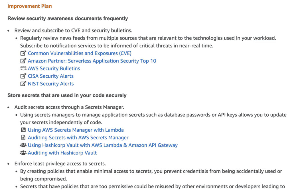 Amazon’s Well-Architected Tool fills that gap. It provides a guide set of questions and suggestions to make sure you have considered and (hopefully) answered the most important questions around: