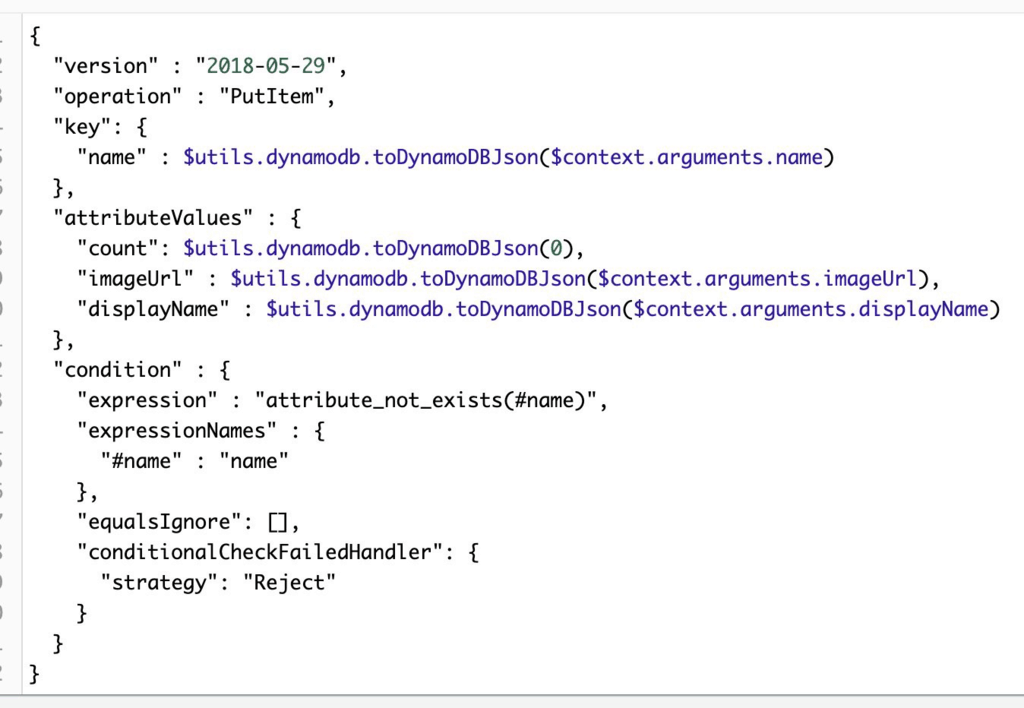 { "version" : "2018-05-29", "operation" : "PutItem", "key": { "name" : $utils.dynamodb.toDynamoDBJson($context.arguments.name) }, "attributeValues" : { "imageUrl" : $utils.dynamodb.toDynamoDBJson(...), "displayName" : $utils.dynamodb.toDynamoDBJson(...) } }