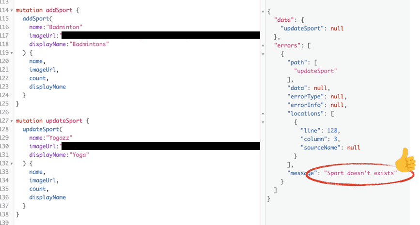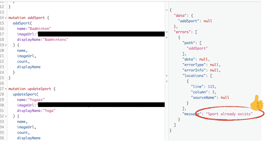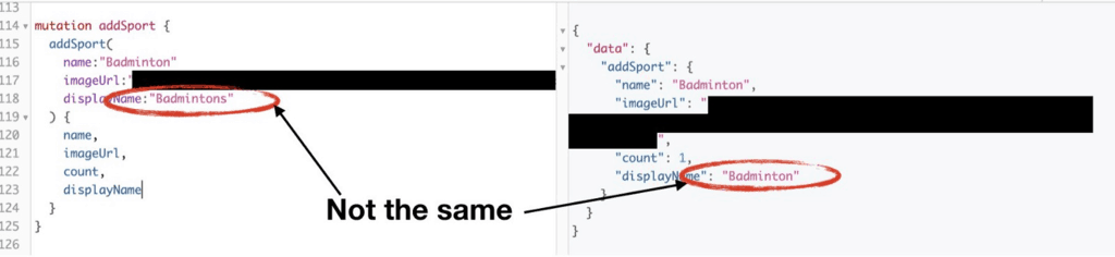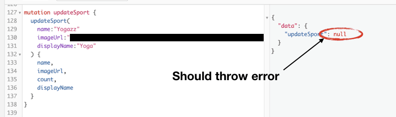 mutation with a non-existent sport should have thrown an error. But instead, it simply returned null