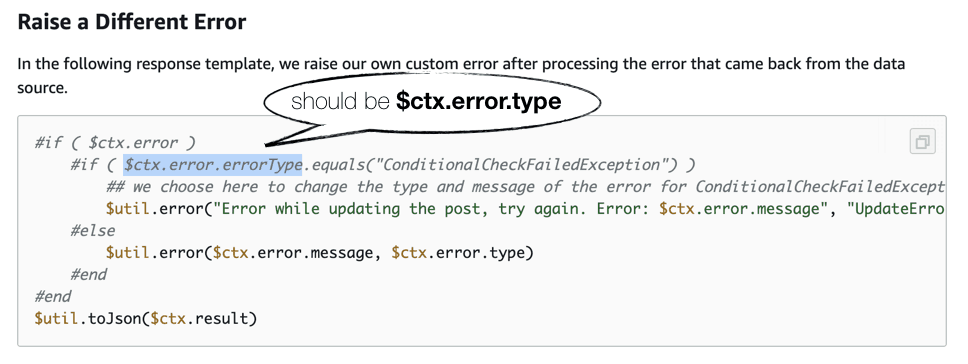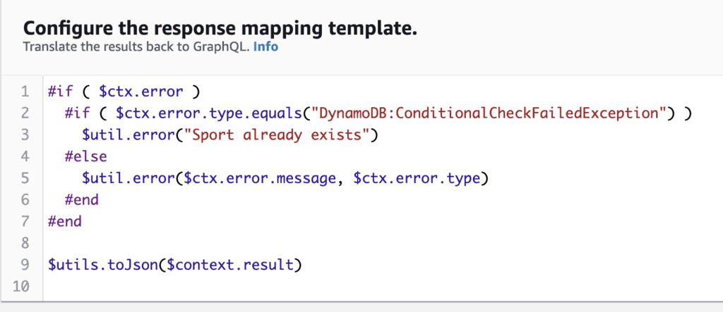 #if ( $ctx.error ) #if ( $ctx.error.type.equals("DynamoDB:ConditionalCheckFailedException") ) $util.error("your error message") #else $util.error($ctx.error.message, $ctx.error.type) #end #end $utils.toJson($context.result)