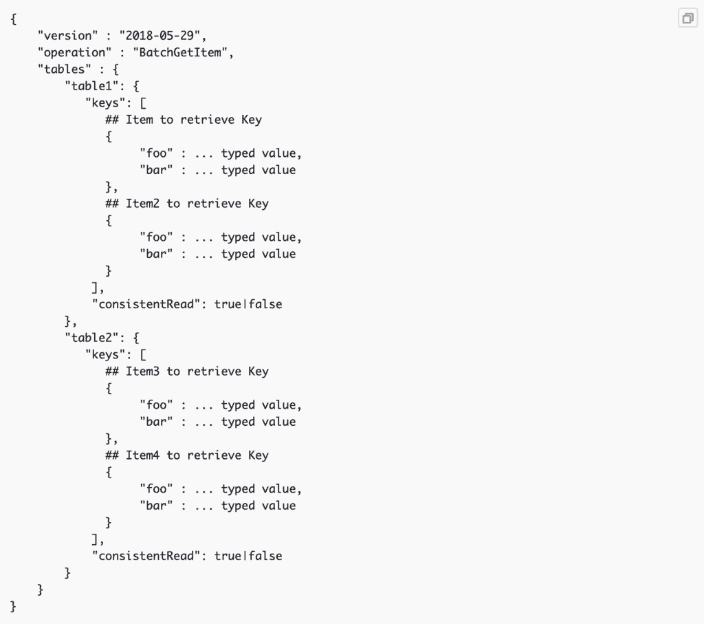 #if ($context.source.participants.size() == 0) #return([]) #end #set( $users = [] ) #foreach( $participant in $context.source.participants ) #set ( $user = {}) #set ( $user.id = $participant.userId ) $util.qr($users.add($util.dynamodb.toMapValues($user))) #end { "version": "2018-05-29", "operation": "BatchGetItem", "tables": { "${UserTable}": { "keys": $util.toJson($users), "consistentRead": false } } }
