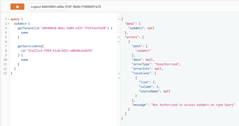 type Mutation { addServiceAreaAsAdmin(tenantId: ID!, name: String!): ServiceArea! @aws_auth(cognito_groups: ["Admin"]) addServiceAreaAsTenant(name: String!): ServiceArea! @aws_auth(cognito_groups: ["Tenant"]) }