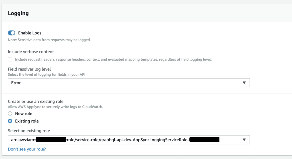 const AppSync = require('aws-sdk/clients/appsync') const appSync = new AppSync() const { APPSYNC_API_ID, FIELD_LOG_LEVEL } = process.env module.exports.handler = async (event) => { const resp = await appSync.getGraphqlApi({ apiId: APPSYNC_API_ID }).promise() const api = resp.graphqlApi api.logConfig.fieldLogLevel = FIELD_LOG_LEVEL delete api.arn delete api.uris delete api.tags await appSync.updateGraphqlApi(api).promise() }