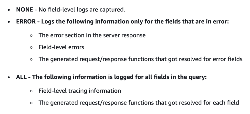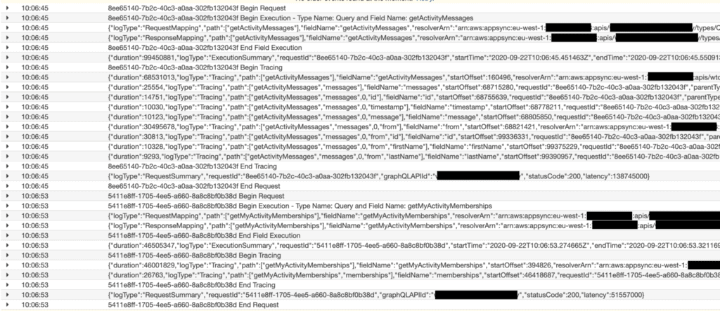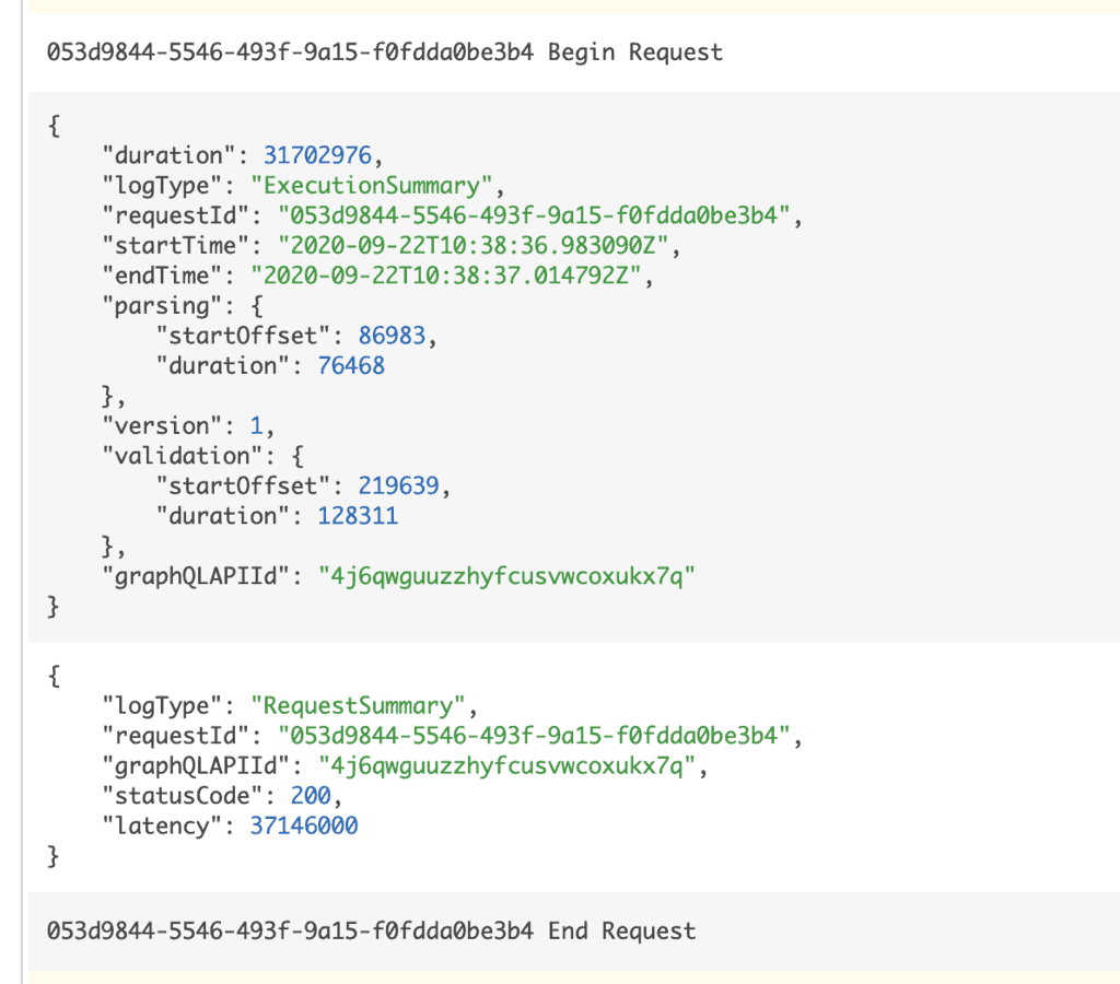 , you don’t get a lot of value from the AppSync logs. For example, this is what I see for a GraphQL request: