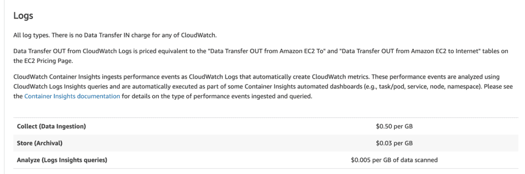 Another important thing to remember is to update the log retention policy for your log groups. Because by default, CloudWatch Logs will never expire your logs and you will pay $0.03 per GB per month for an ever-increasing pile of logs that are less useful with every passing minute.