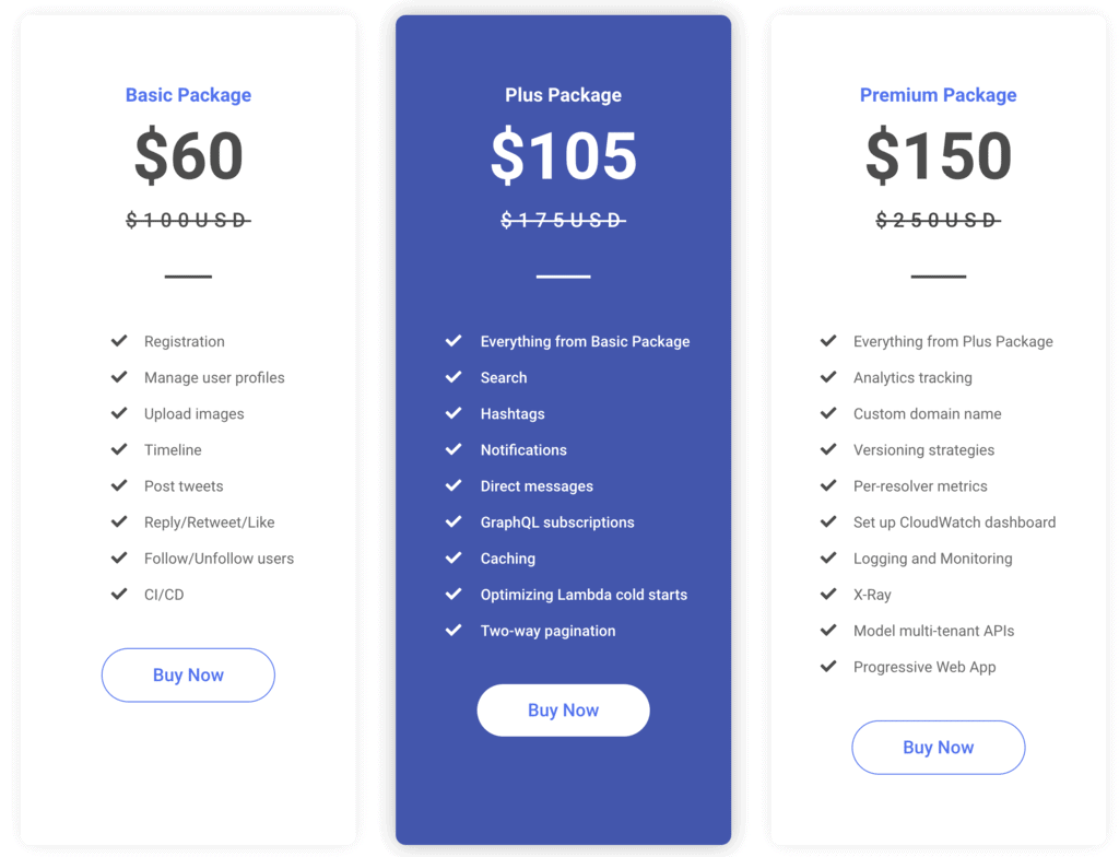 The Premium Package goes a step further and shows you how to track client-side analytics events (e.g. tweet impressions and profile clicks) and take you through the things you need to think about if you want to go to production with AppSync – observability, custom domain names and how to make the frontend a PWA and support local caching, and so on.