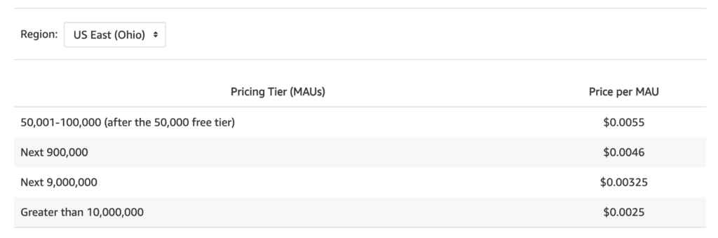 Cognito’s free tier alone (which doesn’t expire after 12 months) allows for 50,000 MAUs. So you pay nothing for that first 50,000 MAUs! Only after that do you start paying $0.0055 per MAU.