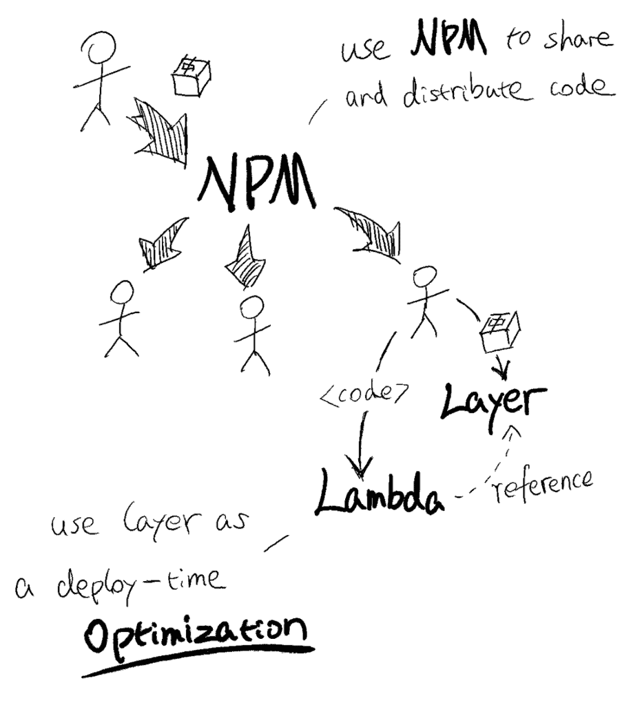 I think this is the right way to use Lambda layers – not as a replacement for NPM, but as a deploy-time optimization.