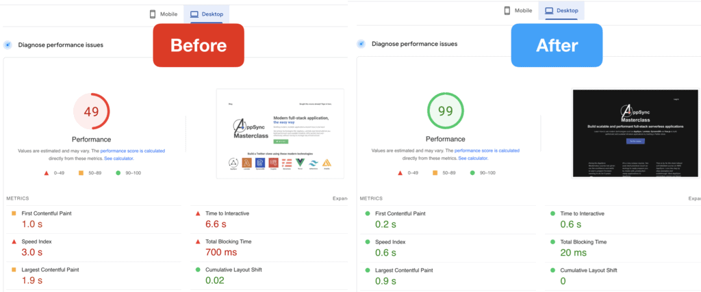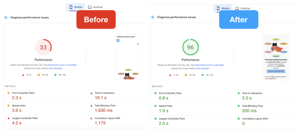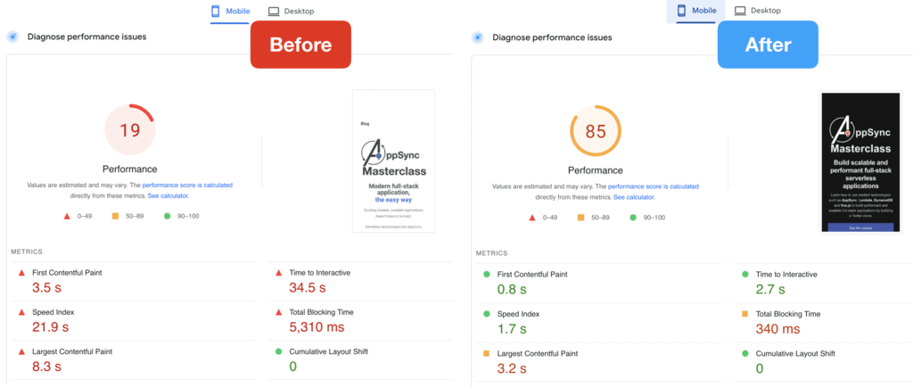 I recently rebuilt the landing page for both AppSync Masterclass and Production-Ready Serverless. The sites were hosted on Shifter (think serverless WordPress) and Wix respectively. In both cases, the performance of the sites (especially on mobile) left a lot to be desired.