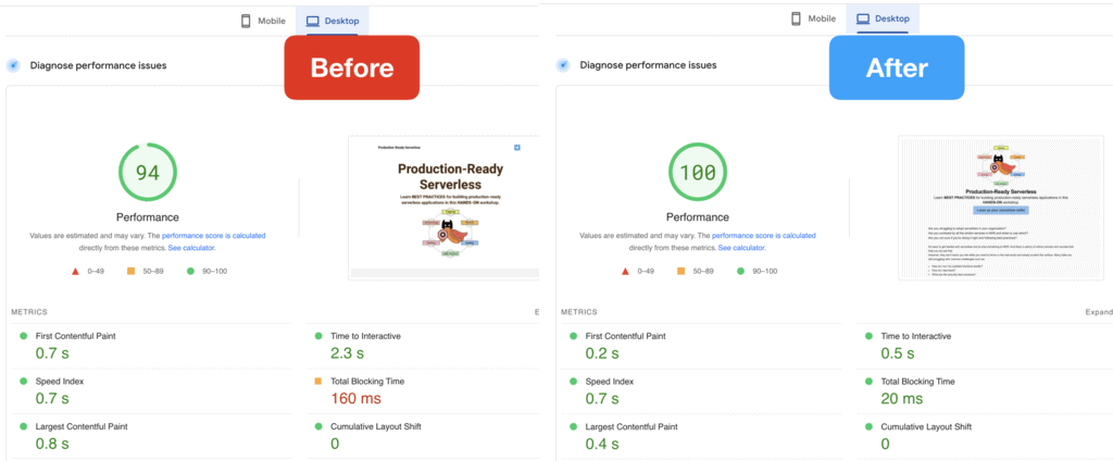 Notice that the Production-Ready Serverless website (previously hosted on Wix) was actually doing OK on the desktop, with a “time to interactive” of 2.3s. And they do some of the aforementioned optimizations already – for example, they automatically convert uploaded images to webp.