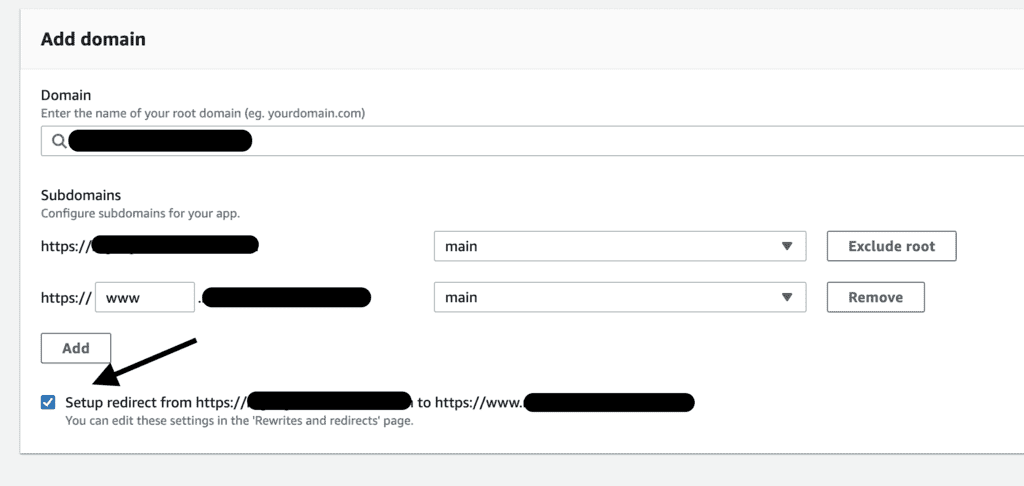If you own a domain, you can also easily attach the domain to an Amplify project. In the configuration screen, you are presented with the option to set up a redirect from the apex domain name to the www domain name, as you can see below.