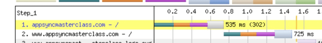 One thing that became painfully obvious as I ran performance test after performance test is that this redirect really hurts the mobile experience. It adds 500ms-800ms to the “time to first byte” on mobile thanks to the extra DNS lookup (green), connection (orange) and SSL handshake (purple) as you can see below.