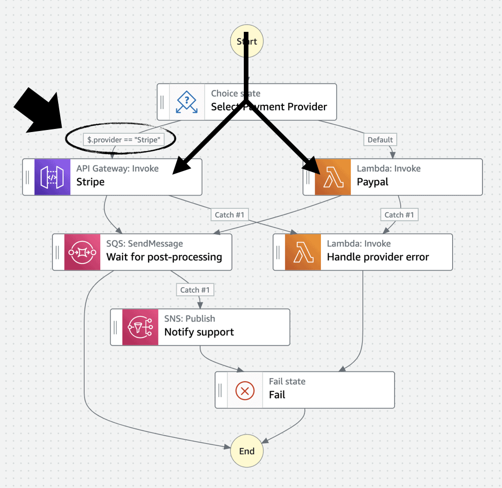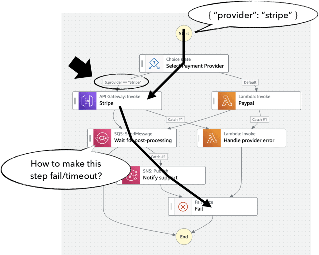 Step Functions are complicated by nature because they consist of many different parts that need to be tested individually. For example, a typical Step Functions state machine might include conditional branching that can direct the execution towards different paths. These paths all need to be tested so we can be sure they are working as expected.