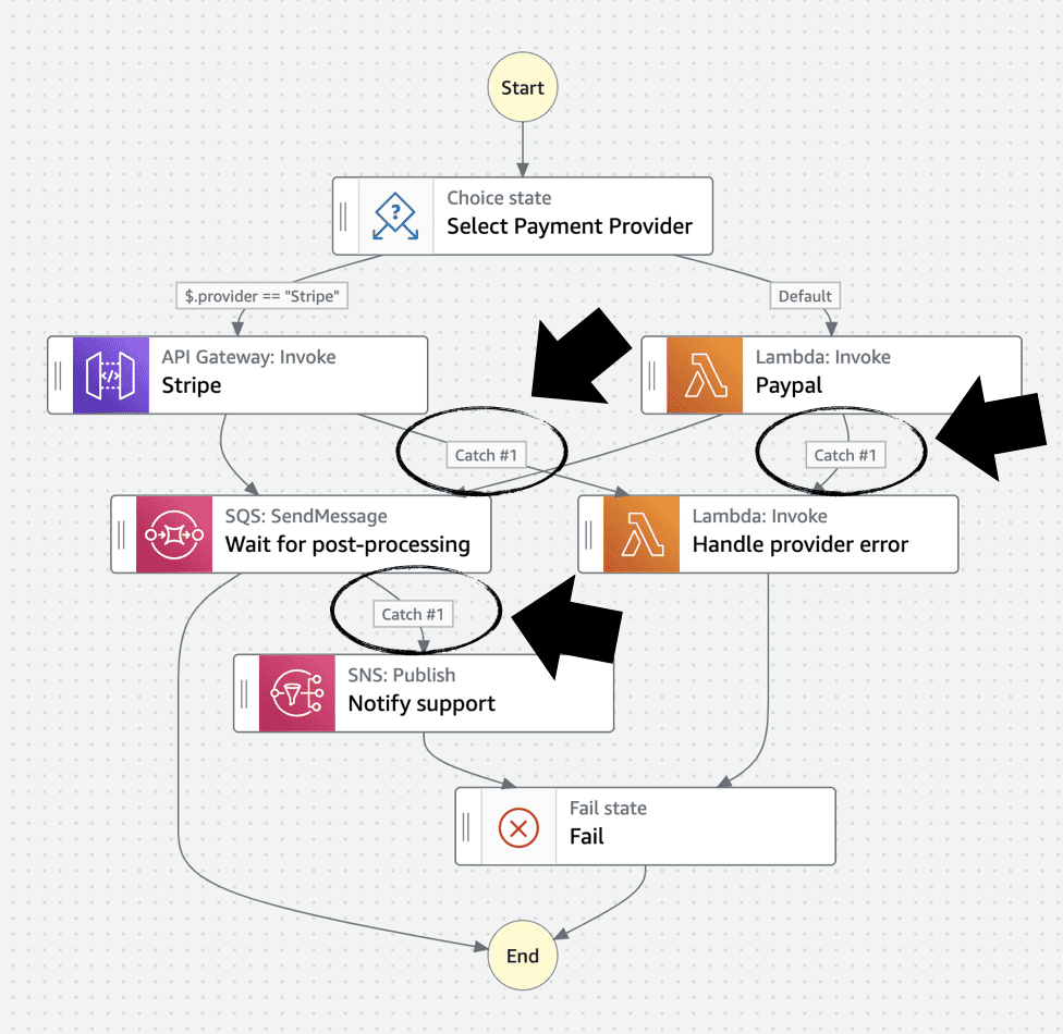 We can also incorporate try-catch logic into our state machine to help us recover from errors that might occur at runtime. This logic also needs to be tested thoroughly to make sure it works properly.