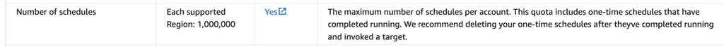 To me, this is the biggest problem with using EventBridge Scheduler for executing one-off tasks right now. It is exactly what I described as the “Scalability (number of open tasks)” criteria above.