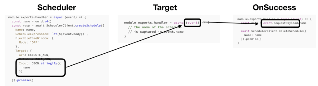 You can see how these fit together in my demo repo. In the repo, this is the API Gateway function that creates the schedule: