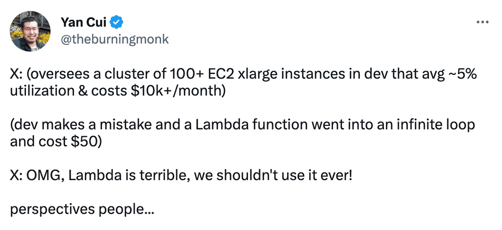 It should be said that every AWS customer should use AWS Budget. It’s not perfect by any stretch, especially since billing data are several hours behind the curve. But it can still help you detect and catch spending abnormalities before they become a bigger surprise, as illustrated by this thread.