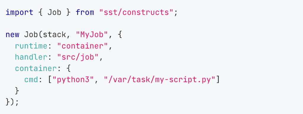 - Use CodeBuild (aka Corey Quinn’s favourite container service) to run ephemeral containers. It takes less work to set up compared to Fargate. SST has a handy
