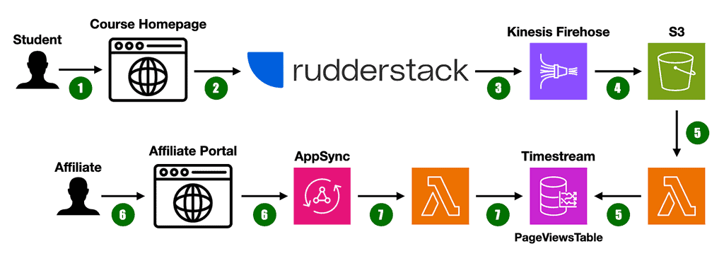 A month ago, I shared how I built an affiliate tracking system in a weekend [1]. Since then, I’ve enhanced the system by integrating analytics reporting, enabling affiliates to gauge the performance of their URLs. This post will describe how the system works and why I chose Amazon Timestream over DynamoDB.