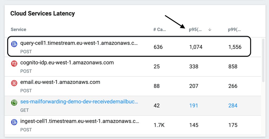 On the other hand, the query latency from Timestream is pretty slow compared to DynamoDB. As you can see from the p95 and p99 latencies below (from my Lumigo [7] dashboard).