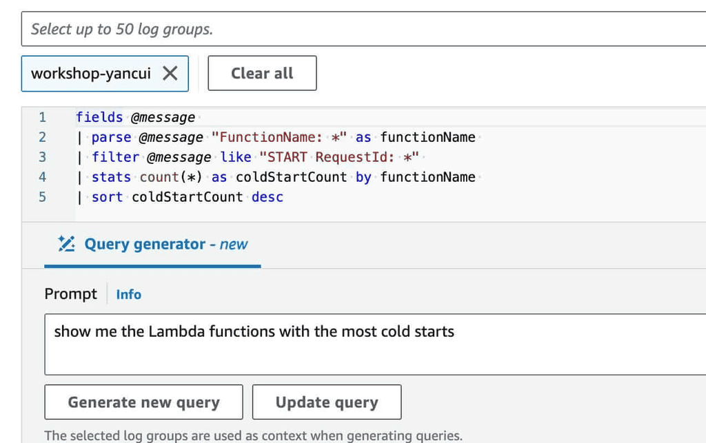 You can now use English to query CloudWatch logs and metrics. In my testing, it often doesn’t get the query right the first time. For example, in the example below, the generated query returns the function with the most invocations, not cold starts.