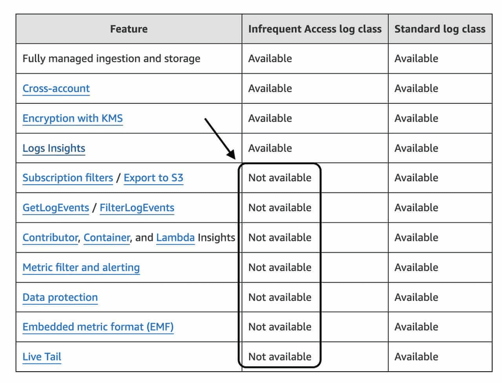 If you don’t need any of these features, then the new infrequent access log class can save you 50% on log ingestion costs. It’s a shame you can’t use subscription filters. This can impact many vendors who use subscription filters today to process and forward your logs.