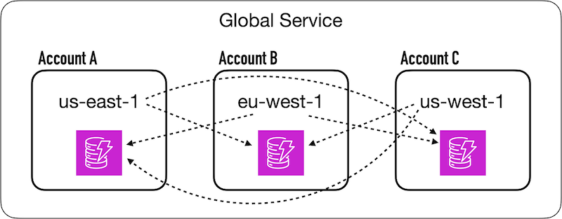 Several Amazon employees mentioned a common architectural pattern within Amazon. A global service would deploy to different accounts – one region per account.