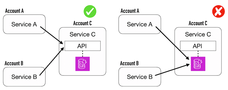 When a service needs to access another service’s data, it should go through its API. It shouldn’t reach in and help itself to their data. It’s insecure and creates a hidden coupling between the two services.
