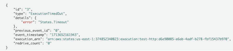 Both Standard and Express Workflows can write logs to CloudWatch. When an execution times out, it writes a log event like this: